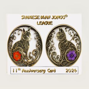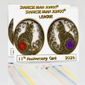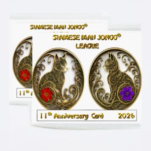 Celebrating 10 years of Siamese Mah Jongg®. Qty 2 – 8th Annual Large 2025 Siamese Mah Jongg® League cards and 2 large protective card Sleeves. Our Sleeves will preserve these very special 10th Anniversary cards. They completely enclose the cards and have closable flaps, making them water resistant. They remain clear over time and are designed to last. Made in the USA. WE ALWAYS RESTOCK THESE CARDS.